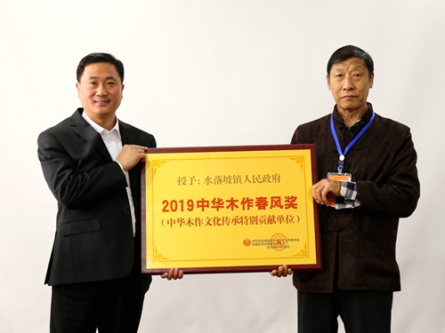 今天我們向水落坡鎮(zhèn)頒授榮譽和稱號,不僅是對水落坡鎮(zhèn)政府工作和水落坡民俗文化產(chǎn)業(yè)的一種肯定,更是向水落坡人為弘揚中華木作文化所做貢獻致敬!