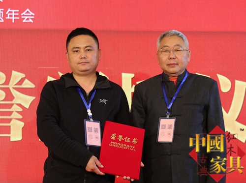 中國明式家具研究會成立大會在京隆重舉行,榮譽頒授環(huán)節(jié),北京金啟元紅木家具有限責(zé)任公司代表馬文勝,接過了由中華木工委和大會授予的榮譽證書,標(biāo)志著金啟元制作的檀香紫檀托泥圈椅在大會的精品鑒賞作品中脫穎而出,與會專家和同行對這款作品給予了高度評價。
