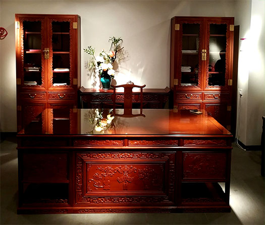 中式古典書房五件套,由書案、官帽椅、二聯(lián)廚、書柜組合而成。此款書房系列,與明式家具有著顯著不同。通常明式書房系列由書案、架格、平頭案等組成。器物整體線條流暢、結(jié)構(gòu)布局疏朗空闊、具有文人風(fēng)骨和氣質(zhì)。其書案和平頭案往往以素面為主,較少具雕刻紋飾,形成的藝術(shù)特點(diǎn)以簡雅為核。這也是當(dāng)前人們審美趨向的一大特征。對此,夏南芬認(rèn)為,關(guān)于書房的陳設(shè)文化,應(yīng)該是多種多樣的,并根據(jù)使用者身份的不同,表現(xiàn)出不同的審美特征。壯達(dá)仕的這款書房五件套,一改明式家具的洗練與簡約,突出了文人精神層面的厚重,因此在設(shè)計(jì)思路上,增添了厚重器型的審美元素。同時(shí),在紋飾上,將中國傳統(tǒng)的祥瑞寓意融合到家具的制作當(dāng)中。就拿大書案來說,以東陽雕刻技法為主,雕刻了福祿壽三種紋飾,而在二聯(lián)櫥和書柜的紋飾雕刻中,又將暗八仙作為主要的紋飾,這對于傳統(tǒng)積習(xí)較深的使用者,會(huì)產(chǎn)生一種文化的趨同,心理上的認(rèn)同。