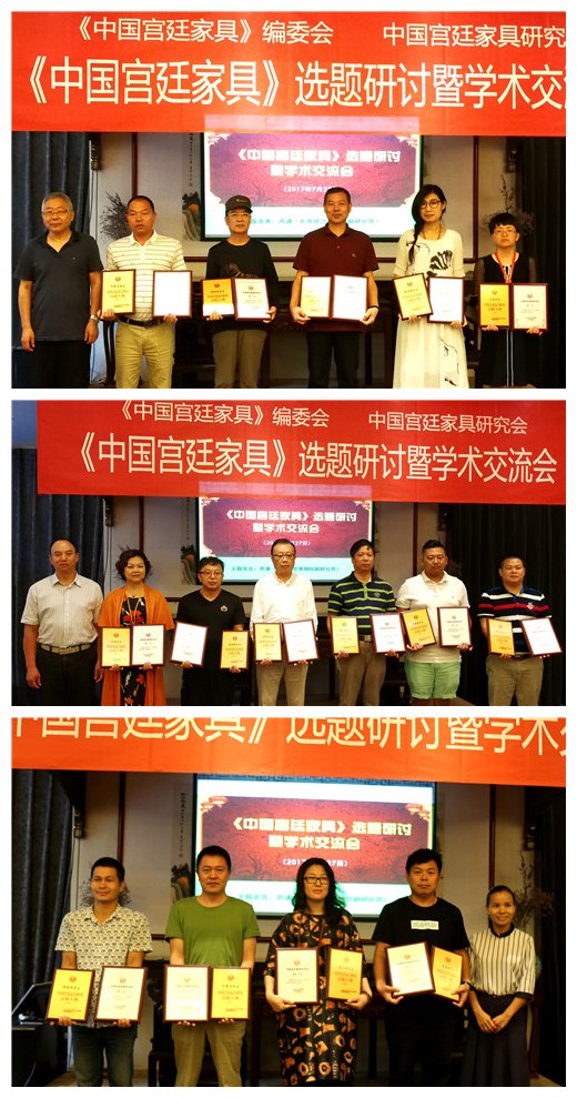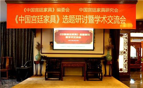 2017年7月27日,由中國宮廷家具研究會、《中國宮廷家具》編委會主辦的《中國宮廷家具》選題暨學術交流會在北京君馨閣紅木友誼賓館會所舉行。中華木工委主任、《中國宮廷家具》編委會副主任趙夫瀛做了講話,中國宮廷家具研究會執(zhí)行會長、北京君馨閣紅木家具有限公司董事長袁劍君致歡迎詞。中華木工委秘書長韋蘭香介紹了《中國宮廷家具》一書的選題內容和選題研討方式。故宮博物院副研究館員、古典家具研究學者芮謙做了題為《大道至簡的明式家具》的學術發(fā)言。