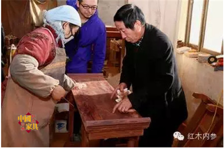 王澤林(右)對(duì)打磨工藝進(jìn)行指導(dǎo) 木器廠要想得到發(fā)展,在工藝和銷(xiāo)路上首先需要突破。在朋友的介紹下,王澤林來(lái)到北京,在東單信托公司看到很多明清老家具,并且開(kāi)始接觸明清家具的修復(fù)工作。后來(lái)在清史專(zhuān)家于善普的介紹下,王澤林進(jìn)入故宮修復(fù)明清皇家家具。在故宮里,王澤林如入寶庫(kù),成百上千件“造辦貨”,“一木連做”、燕尾榫等傳統(tǒng)工藝……王澤林開(kāi)了眼,明清家具制作及修復(fù)的技藝水平也就在此時(shí)突飛猛進(jìn)。因?yàn)榧妓嚫叱?,曾主持滿(mǎn)城漢墓金縷玉衣修復(fù)工作的馬更生也找他修復(fù)家具。“明清家具的制作工藝極具科學(xué)性,結(jié)構(gòu)更為耐久,現(xiàn)在很多木工都掌握不了”。王澤林說(shuō)道。
