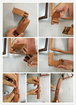 其師古不泥古,還表現(xiàn)在其對(duì)傳統(tǒng)榫卯結(jié)構(gòu)的繼承和發(fā)揚(yáng)上。傳統(tǒng)的榫卯結(jié)構(gòu)由于材料選擇、干燥技藝、制作工藝等,由于歷史科技水平的客觀原因所限,只能表現(xiàn)出那個(gè)歷史時(shí)期的特征,但用當(dāng)代的科技眼光來看,局限性就會(huì)表現(xiàn)得比較突出。謝勇認(rèn)為,工藝不能夠完全照搬,而應(yīng)該在原有的工藝細(xì)節(jié)上,進(jìn)行進(jìn)一步的完善,使之達(dá)到更高的標(biāo)準(zhǔn)和要求。就拿皇宮椅的圈帶接口來說,明清家具中的傳統(tǒng)做法都是以楔釘榫為固定結(jié)構(gòu)的常用手段。從許多流傳下來的老式經(jīng)典款來看楔釘榫通常為正方形。但在生產(chǎn)過程中,謝勇發(fā)現(xiàn),圈帶接口部分的咬合,在使用過去正方形楔釘榫時(shí),會(huì)偶爾出現(xiàn)細(xì)微的縫隙。開始,謝勇對(duì)此百思不得其解。按理說椅圈的連接用楔釘榫是古人流傳下來的非常成熟的工藝,那么在生產(chǎn)過程中為什么會(huì)出現(xiàn)連接不緊密的狀況呢?經(jīng)過數(shù)不清的試驗(yàn),謝勇發(fā)現(xiàn),正方形的楔釘榫在椅圈連接時(shí),不僅有縱向的拉力,也會(huì)產(chǎn)生橫向的拉力。這樣一來,椅圈的接口就會(huì)發(fā)生連接不緊密狀況,為此,謝勇做出了一個(gè)大膽的決定,將楔釘榫改為矩形,降低橫向張力,加強(qiáng)縱向拉力,很好地解決了椅圈接口連接不緊密的問題。
