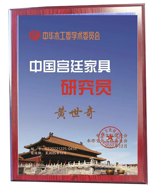 經(jīng)中華木工委學(xué)術(shù)委員會(huì)批準(zhǔn),黃世奇同志(衡水藝舍木業(yè)有限公司董事長(zhǎng))任職中華木工委學(xué)術(shù)委員會(huì)中國(guó)宮廷家具研究員,任期至2025年12月。