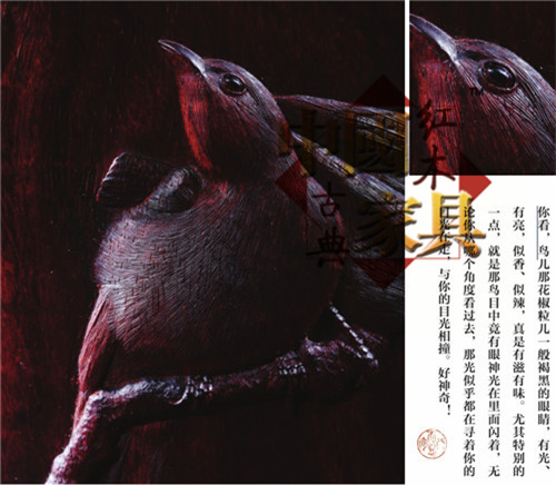 你看,鳥兒那花椒粒兒一般褐黑的眼睛,有光、有亮、似香、似辣,真是有滋有味。尤其特別的一點,就是那鳥目中竟有眼神光在里面閃著,無論你從哪個角度看過去,那光似乎都在尋著你的目光在走,與你的目光相撞。好神奇!
