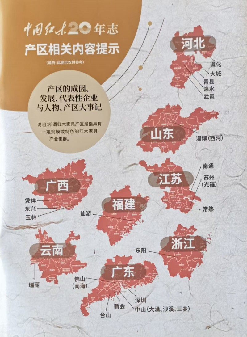 也就是說,中國(guó)紅木家具的主產(chǎn)區(qū)至少有15、6個(gè),山東西河便是其中之一。大家可以看看這張圖,它是2011年6月號(hào)《中國(guó)紅木古典家具》雜志上刊登的中國(guó)紅木產(chǎn)業(yè)產(chǎn)區(qū)分布圖(這里是《中國(guó)紅木20年志》宣傳冊(cè)的復(fù)制頁)。之后我會(huì)對(duì)這些主要產(chǎn)區(qū)逐一進(jìn)行介紹,這次就先說說西河。