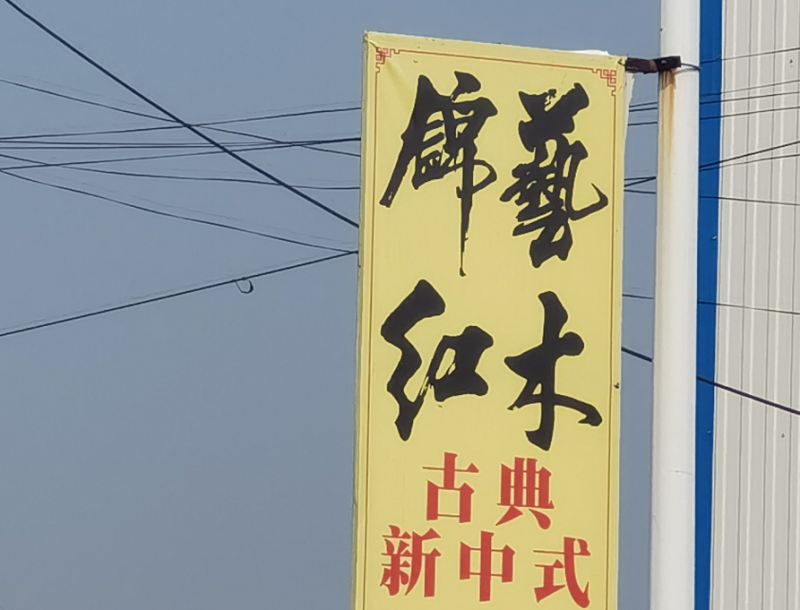 以廣場(chǎng)為中心,向東西南北四個(gè)方向都有延伸道路,西河的紅木企業(yè)大多分布在這幾條道路兩側(cè)。所以每次到西河,我們都會(huì)開車在這幾條路上轉(zhuǎn)一轉(zhuǎn)。我們看到,從北邊和西邊通向廣場(chǎng)的道路兩側(cè)燈桿廣告都是錦藝紅木的,而廣場(chǎng)向東綿延幾公里的燈桿上,全是閆仕紅木的廣告。