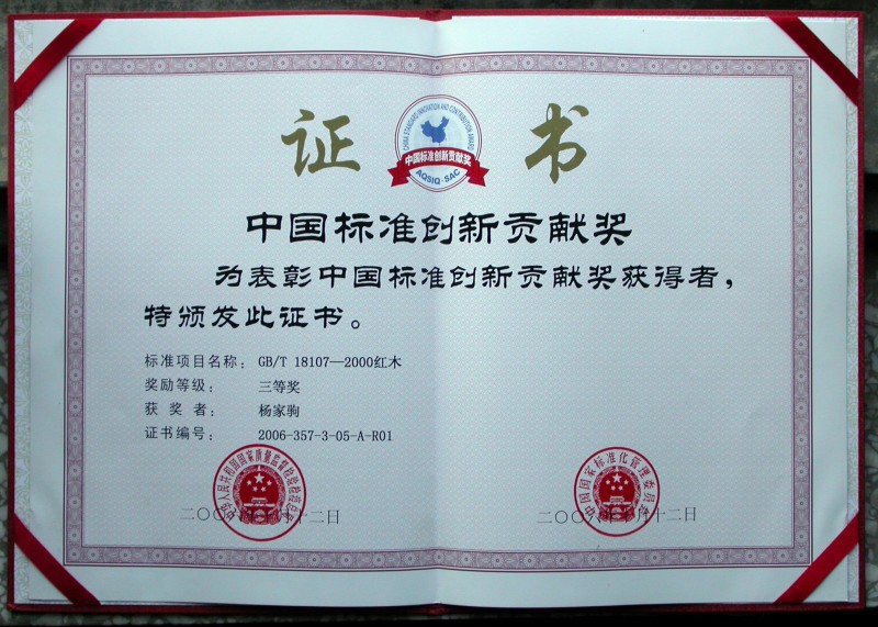 因起草《紅木》國標,2006年10月12日,楊家駒先生榮獲“中國標準創(chuàng)新貢獻獎”。這是趙夫瀛在當年拍攝的楊家駒先生的獲獎證書。