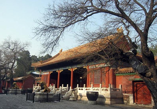 ▲養(yǎng)性殿外景 整體座屏為三屏式結(jié)構(gòu),正面精刻山水圖案,山巒巍峨起伏,樓閣、草廬掩隱林中。溪流之上一小橋,橋上行來(lái)雅集高士。溪旁涼亭雅士正在品茗、撫琴、會(huì)棋,一派的幽靜祥和。而其中最醒目之處,就是乾隆的三首御題詩(shī)了。