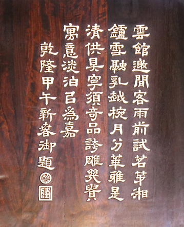 一方面是仿舊如舊,另一方面又要適度改良。比如,原件背板為楠木,仿制品改成了通體紫檀;原件的御詩(shī)題字是紫檀描金,仿制品改為了象牙雕刻。應(yīng)該說(shuō),仿制品比原件更顯奢華,如若乾隆在世,也會(huì)驚嘆不如吧!