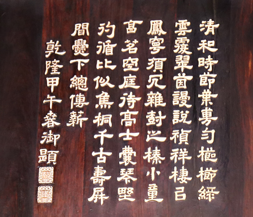 ▲右扇中扇屏風(fēng),刻乾隆三十九年御制《詠木刻桐院清陰圖屏》詩(shī):“清和時(shí)節(jié)葉旉勻,櫛櫛緑云覆翠茵。謾說(shuō)禎祥棲已鳳,寧須冗雜樹之榛。小童烹茗空庭待,高士囊琴野彴循。比似焦桐千古壽,屏間爨下總傳薪。”