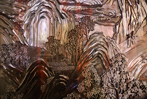走進(jìn)北京西四環(huán)紅博館的恭泉舫展廳,迎面一幅大屏風(fēng)赫然而立,射燈映照下的木雕山水圖案,泛著黑紫色的光澤,威嚴(yán)氣勢(shì)撲面而來(lái)。這就是恭泉舫的鎮(zhèn)店之寶——紫檀山水大座屏。